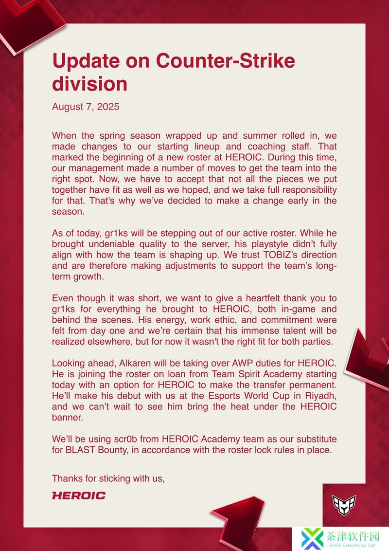 “HEROIC已经下放gr1ks,并且租借Alkaren一年。Alkaren的首秀会是电竞世界杯。”不过在BLAST 赏金赛期间,HEROIC Academy(青训队)选手Scr0b会暂时上场填补阵容空白。