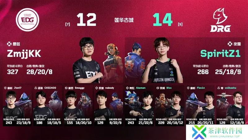 Wan Shunzhi (万顺治) | CHICHOOC点拿首杀,康康A大四杀阻击DRG攻势。DRG顽强追平比分。第22回合DRG进攻C点未清点,遭EDG直架反打。第23回合DRG抢占B点,SpiritZ1残局击杀球球取胜。第24回合,SpiritZ1夜露开大强攻C区,EDG混战回防将其逼退点外,Jieni7烟中扫射将比赛拖入加时。加时赛首轮,DRG连下两分,Nicc决胜残局一打二完成绝杀。DRG 14-12 力克EDG,赢下莲华古城。