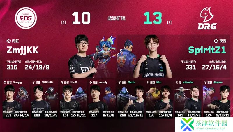 下半场EDG赢下手枪局。第15回合A大2换2后,EDG转B下包被Akeman三杀翻盘。DRG连下两分。第17回合EDG强攻A点,经济局翻盘得手。两队缠斗至10平。第21回合DRG沉着布防,将EDG封堵B外。第22回合B点再战,DRG固守拿下赛点。最终回合,DRG中、B联防制胜。DRG 13-10力克EDG,拿下盐海矿镇。