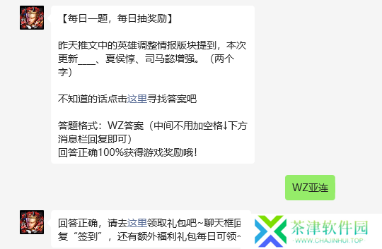 问题:昨天推文中的英雄调整情报版块提到,本次更新____、夏侯惇、司马懿增强(两个字)。