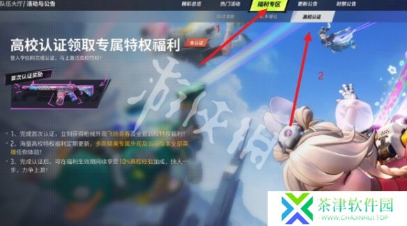 2、跳转界面后,依次点击顶部的【福利专区】和【高校认证】按钮。