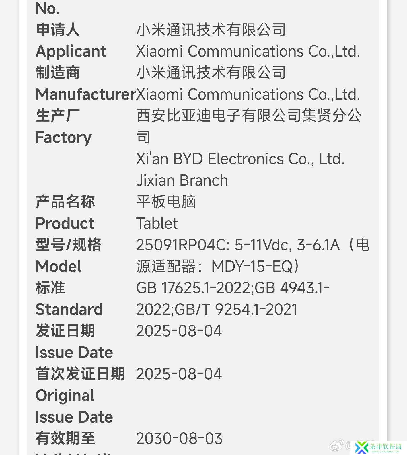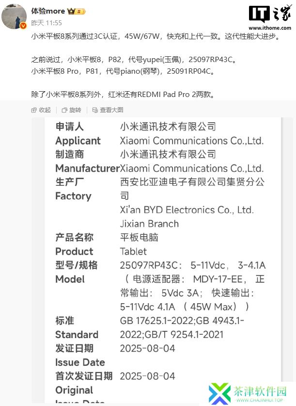 本站 8 月 7 日消息,两款小米平板新品于 8 月 4 日通过了国内 3C 认证,支持 45W / 67W 快充,和上代一致。据博主 @体验more 透露,这两款产品为小米平板 8 系列。