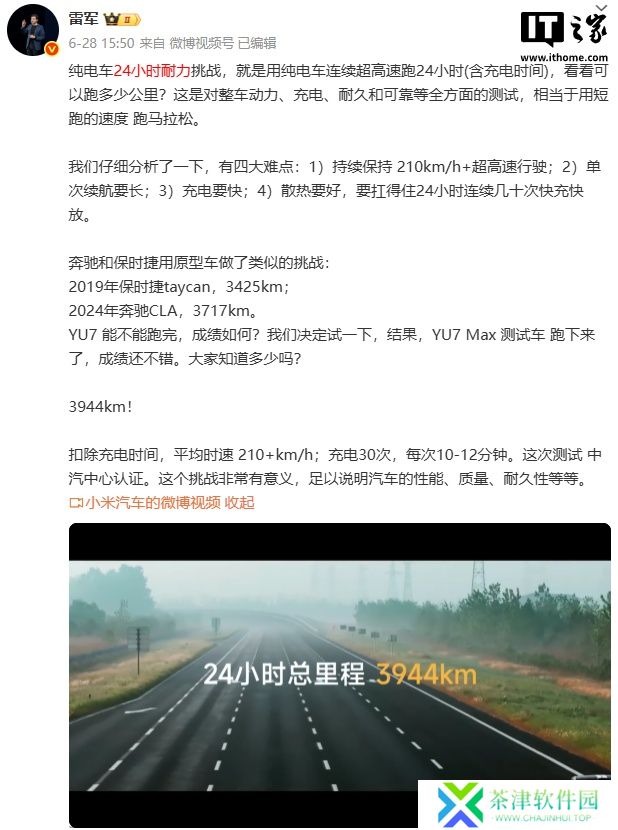 本站注意到,小米 YU7 Max 测试车今年 6 月曾进行一场纯电车 24 小时耐力挑战,就是用纯电车连续超高速跑 24 小时(含充电时间),看看可以跑多少公里。其最终成绩为 3944km,扣除充电时间,平均时速 210+km/h;充电 30 次,每次 10-12 分钟,这次测试获中汽中心认证。