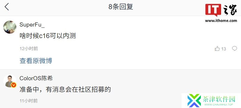 本站注意到,OPPO ColorOS 设计总监陈希今日在微博与用户互动时透露了下一代系统的动态。据称,ColorOS 16 系统准备中,有消息会在社区开启招募。