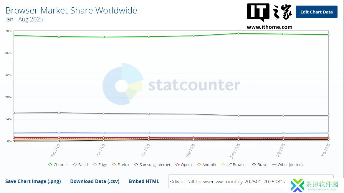 本站发稿前,查询 Statcounter 平台统计数据,目前 Firefox 浏览器的全球占比为 2.45%,而在 2025 年 1 月的占比为 2.54%,整体呈现不断下滑的趋势。