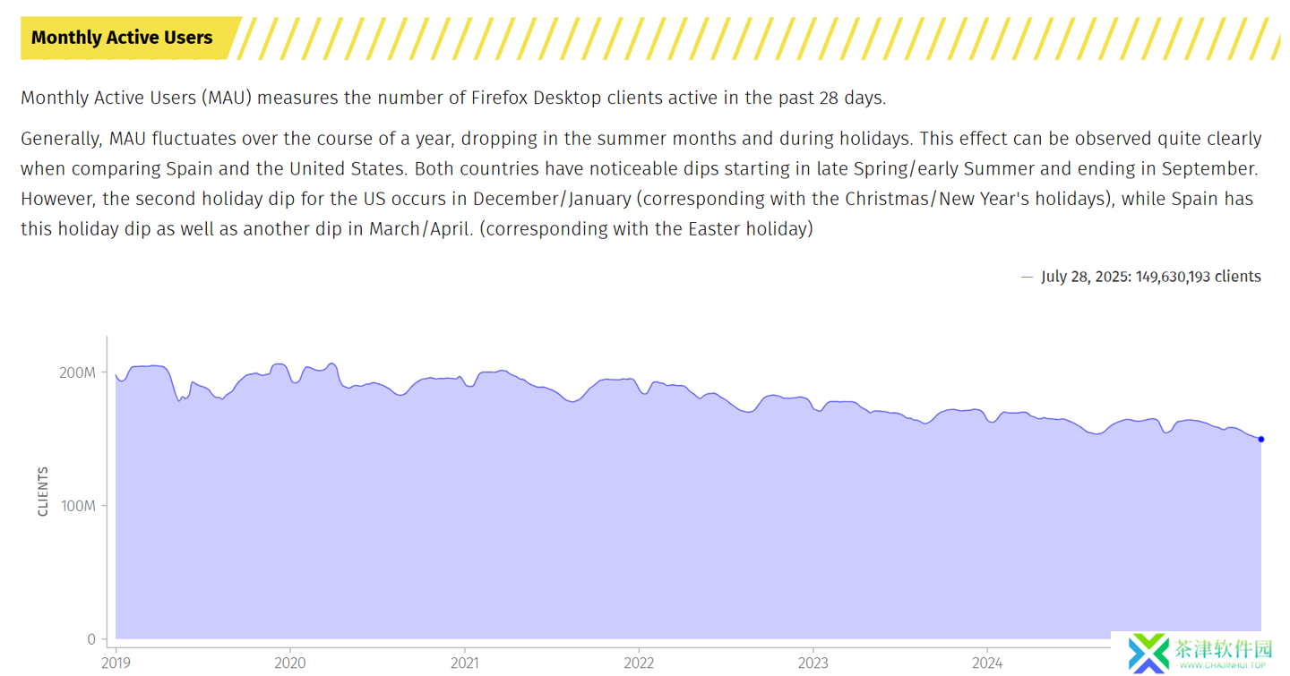 本站 8 月 7 日消息,根据官方统计数据,2025 年第 31 周(7 月 28 日周一开始计算),火狐 Firefox 浏览器的全球周活跃用户数量首次跌破 1.5 亿,活跃用户数据为 149630193。