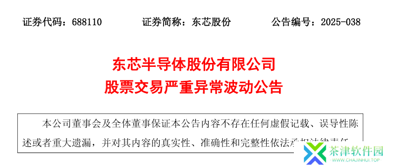 东芯半导体股份有限公司今日发布股票交易严重异常波动公告,表示股票交易连续 10 个交易日内(2025 年 7 月 25 日至 2025 年 8 月 7 日)日收盘价格涨幅偏离值累计达到 100%。