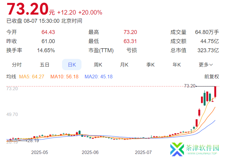 产品发布后,砺算科技的大股东 —— 东芯半导体股份有限公司(持股 37.88%)股价一路飙升,由原来的每股 30 元左右飙升到今日的 73.2 元,翻了一倍多,今日还实现涨停。