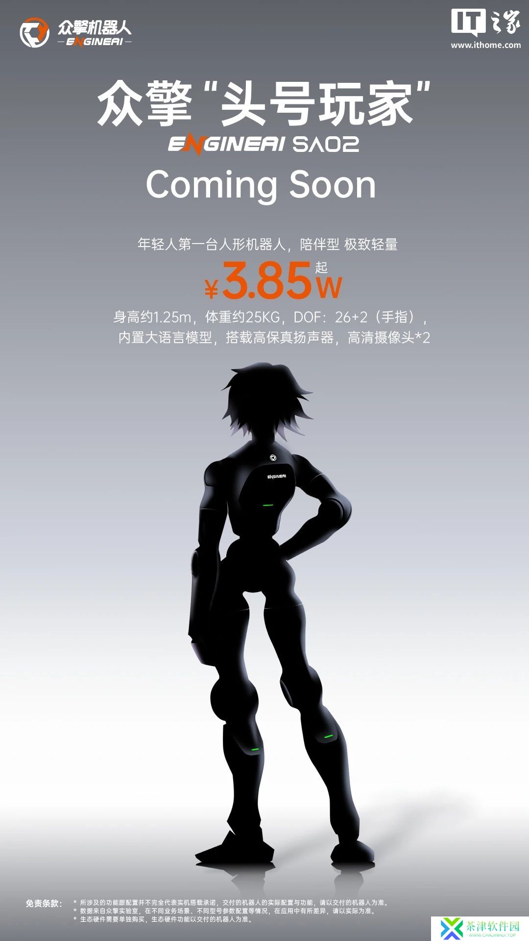 从海报可以看到,该机器人采用细长身材设计(可能有头发),身高约 1.25m,体重约 25kg,拥有 26+2(手指)自由度,内置大语言模型,搭载高保真扬声器,2 个高清摄像头,主打陪伴,售价 3.85 万元起。